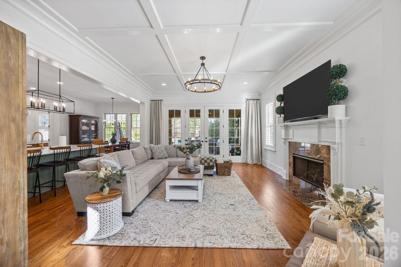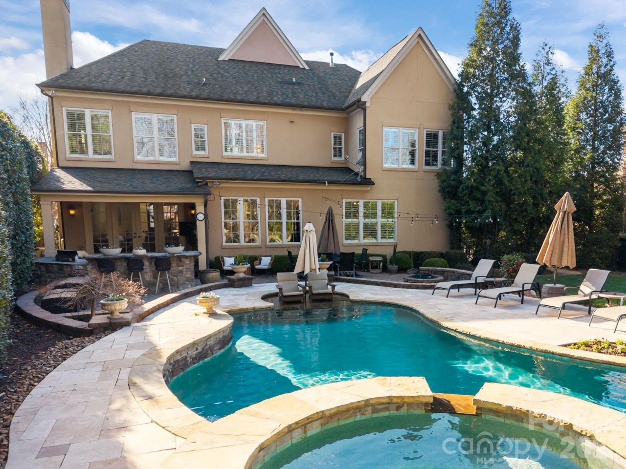 Welcome in and welcome home to this impeccably maintained custom residence in the prestigious, gated Christenbury Hall community, in the award-winning Cox Mill school district. Situated on a private cul-de-sac lot, this residence was masterfully crafted by the acclaimed Simonini Homes, the only builder in the region to achieve the prestigious Triple Crown of homebuilder excellence, and continuously refined with tasteful updates and timeless upgrades.Freshly painted and bathed in natural light, the home makes a commanding first impression with a two-story foyer featuring 20' ceilings and an 8' mahogany front door. Throughout the main level, you'll find jaw-dropping millwork, including coffered ceilings in the living room, stately baseboards, and premium crown molding. The living room serves as a sophisticated centerpiece, anchored by a beautiful gas fireplace shrouded with an intricate mantel and gleaming marble surround.The heart of the home is the remodeled kitchen (2025), featuring dual Bosch ovens, a gas range, and a functional scullery that flows seamlessly into the cozy keeping room. Entertainers will gravitate toward the fully custom butler's station off the dining area, complete with gorgeous butcher block counters and a dedicated space for a wine fridge. For those who work from home, the first floor offers a dedicated office/flex space designed for productivity.Retreat upstairs to the primary suite, a true sanctuary featuring tray ceilings, a wainscotted vestibule, and a spa-like bath with dual vanities, a garden tub, and a shower with dual heads. The oversized his and hers walk-in closet includes custom-built-in shelving, as do all other closets in the home.The second level continues to impress with an exceptionally large second bedroom, featuring vaulted ceilings and an ensuite. Two additional bedrooms share a Jack-and-Jill bath with beadboard trim and a separate wet room. A generous bonus space completes the floor, perfect for a high-end home theater, gym, or playroom.Back downstairs, step through the rear French doors to a gateway of indoor-outdoor luxury. The covered patio, equipped with a TV and outdoor speakers, leads to a stone outdoor kitchen featuring a built-in gas grill, mini-fridge, and bartop seating.The three-tier backyard invites you into a custom, heated saltwater pool set against lush, colorful landscaping and a private, wooded backdrop for the ultimate escape. You can spend your afternoons tanning on the flagstone sundeck or sitting beneath one of three waterfalls, then walk across the cool travertine decking to the eight-person hot tub to relax to the serene sound of flowing water as the sun sets behind your future home's imposing roofline. Evenings are best spent by the paver stone fire pit under the ambient glow of string lights, while the adjacent large grass space offers the perfect setting for yard games and outdoor recreation.No detail has been overlooked, from the plantation shutters throughout to the